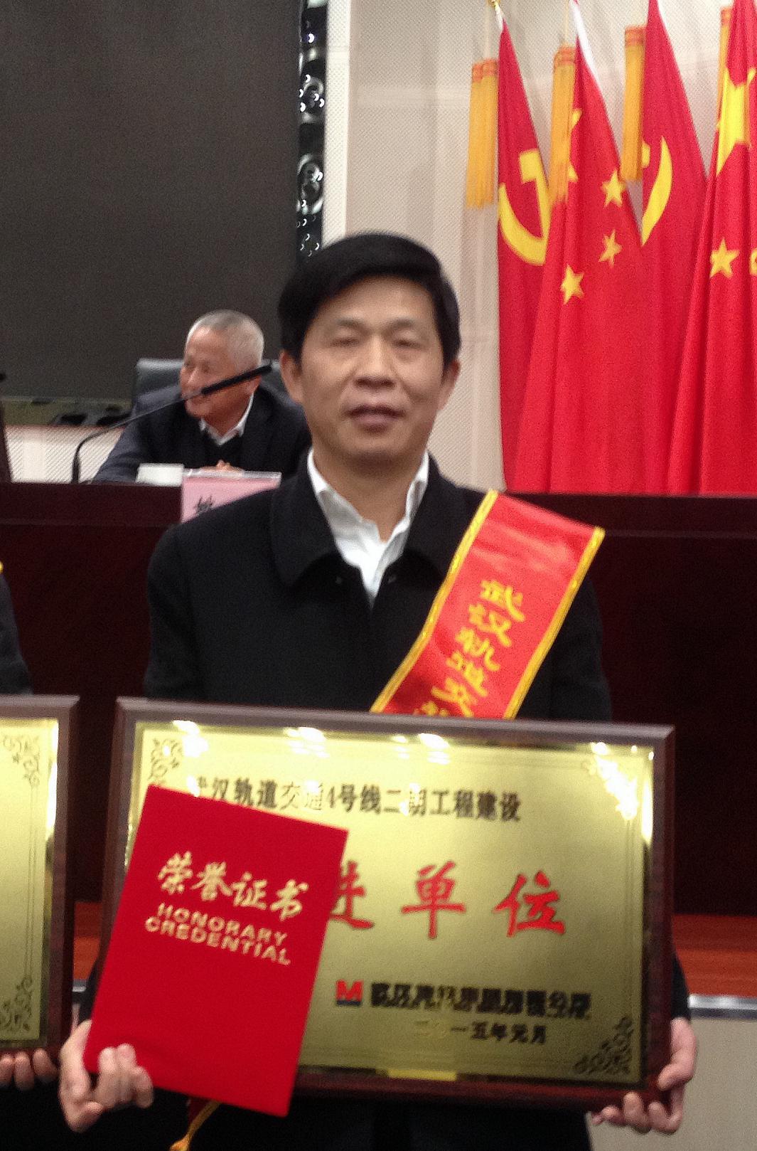 一月二十三日,武漢地鐵集團舉行了軌道交通4號線二期及1號線漢口北延長線工程建設立功單位和先進單位表彰大會。參與軌道交通4號線二期及1號線漢口北延長線兩項工程建設的各勘察設計單位、施工單位、監(jiān)理單位、設備材料供應及安裝單位的代表齊聚一堂,表彰先進,交流經驗,謀劃軌道交通網絡化建設新篇章。市人民政府副市長張光清、副秘書長及重點辦主任馬澤江、市城建委副主任張利、地鐵集團公司董事長劉玉華、總經理周少東出席大會,廖建生董事長代表我公司參加表彰大會并上臺領獎。