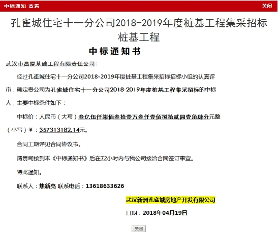2018年4月19日,我司經(jīng)過多輪競爭報價,成功中標(biāo)孔雀城住宅十一分公司2018-2019年度樁基工程集采招標(biāo)樁基工程,中標(biāo)價為3.57億元。